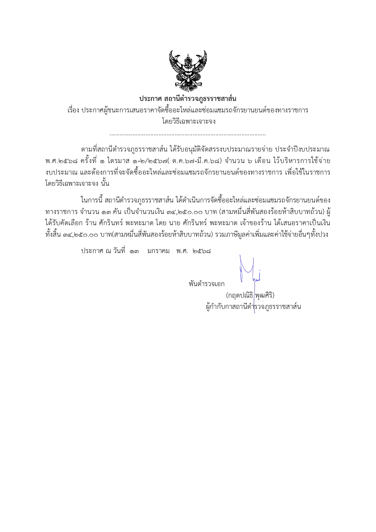 ประกาศผู้ชนะการเสนอราคาการจัดซื้อจัดจ้าง ซ่อมแซมรถจักรยานยนต์ของทางราชการ โดยวิธีเฉพาะเจาะจง เดือนมกราคม 2568
